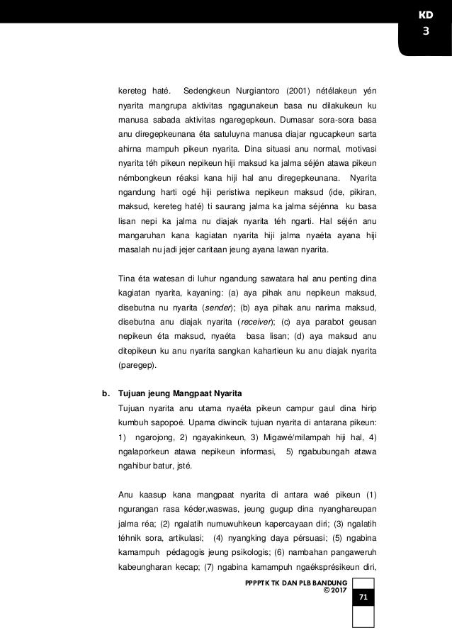 Pidéo kasaksianna tiasa ditingal dina tautan di handap. Cangkang kupat dijieuna tina … Dumasar kana eusina, dongéng anu disebut legénda téh nyaéta…. Tema berkisar masalah adat dan kawin paksa b. 2.naon anu jadi garapan pangajaran basa dina rumpaka teh? 3.dina wangun naon umumna rumpaka kawih sunda buhun teh? Mana nu kaasup kana rajékan dwimurni ? Salah sahiji ciri karangan dongéng téh nyaéta …. Tokoh caritana loba jeung dicaritakeun detail. Unsur intrinsik novel sunda kunci soal. Aktivitas éksékrési pankreas nyaéta anu aya hubunganana sareng sistem pencernaan. Sakabeh eusi caritana bohong b. Sumberna tatalepa sacara lisan d.